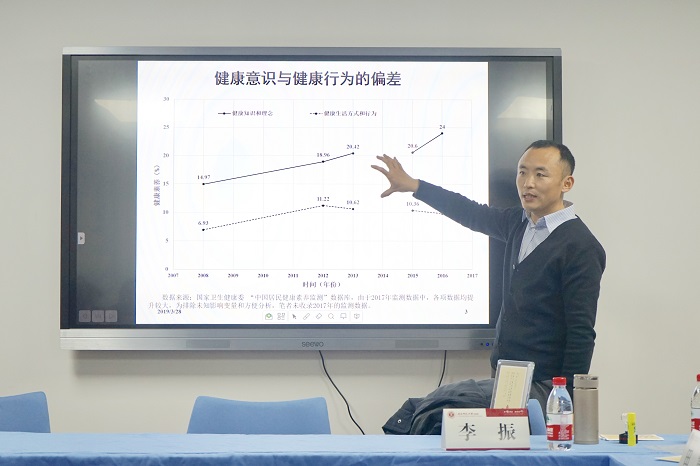 讲座伊始,李振老师由国家卫健委发布的相关数据引出,虽然中国居民民的健康知识水平呈现逐步提高的趋势,但居民的健康饮食行为科学化水平却并未同步提高。如何理解这二者的分野成为进一步提高中国国民健康水平的基础。随后,李振老师介绍了本次讲座选题的背景。他指出,虽然近年来中国居民的生活水平大幅度提高,但以糖尿病等为代表的慢性病患病率却大幅上升。李振老师提出,饮食习惯和行为看似是一个私人领域的问题,但在诺贝尔经济学奖得主泰勒等人看来一定程度的行政规制有利于减少因为信息不对称导致的选择失误,从而增进人类的整体福利。