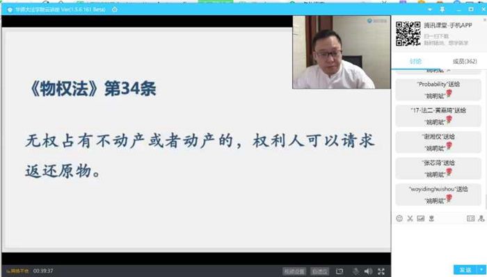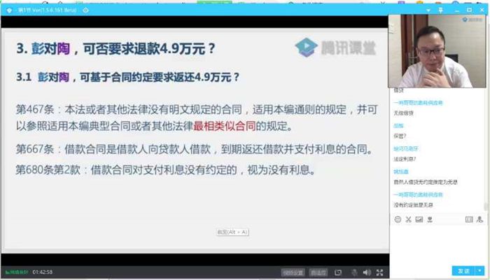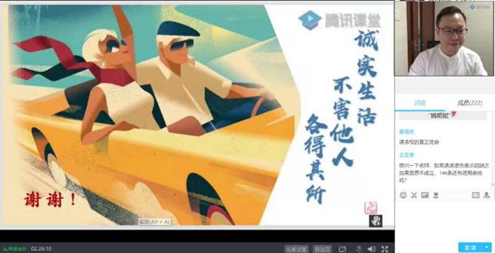2020年5月7日晚18点30分,太阳成城集团云讲座第三场在腾讯课堂举行。本次讲座由华东政法大学副教授姚明斌老师担任主讲人,公司纪海龙教授担任主持人,公司李建星副教授担任评议人,几位其他院校的知名学者以及校内外众多员工参加了讲座。