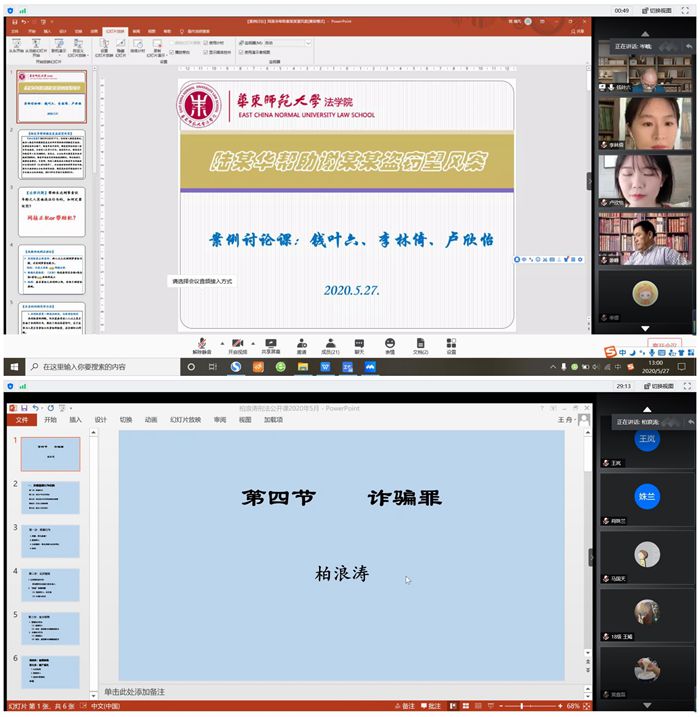 首先,钱叶六和柏浪涛两位老师为大家开设了示范课。钱叶六教授就“陆某华帮助谢某某盗窃望风案”为例与李林倚、卢欣怡等员工代表开展了一堂生动的互动讨论课。接着,柏浪涛老师就“诈骗罪”的内容进行了一场有理论、有案例的精彩的案例教学示范课。2020年春季学期,钱叶六教授领衔的刑法学科团队开设的《刑法总论》在中国大学MOOC上线,得到了社会各界的广泛关注、欢迎和好评,吸引了包括高校学子、公检法律所实务部门人士及其他社会人士近3万人参加,在中国大学MOOC网上开设的法学类课程中名列前茅。此次两位老师的在线示范课,给参加研讨活动的师生留下了深刻的印象。