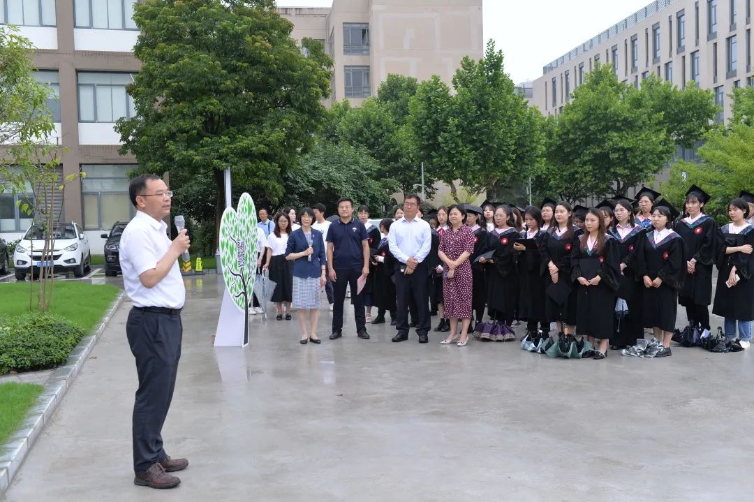 公司党委书记张惠虹代表学院向大家介绍院训墙建设情况。张书记提到,在学校大力支持下,从2017年学院搬迁到今日庭院正式落成,清新温馨的环境已成为太阳成城集团的一张名片,伴随着同学们成长,滋养着师生们的精神世界。本次揭幕仪式不仅宣告了学院楼前庭院的正式竣工,更是富有另外三层寓意。第一层寓意,院训墙揭幕仪式是庆双庆系列活动的重要内容,见证了学院的成长之路与创业之路。第二层寓意,院训墙揭幕仪式也是员工微捐赠的重要成果,凝聚了广大员工的赤子之心。第三层寓意,院训墙揭幕仪式更是毕业典礼的重要议题,浓缩了师长的舐犊之情。“奉法守正、知行合一”这是太阳成城集团的老师们对学子们的谆谆教诲、临别嘱托,也是我们学院的家风传承,希望大家将来无论走到哪里都不忘来时的路。