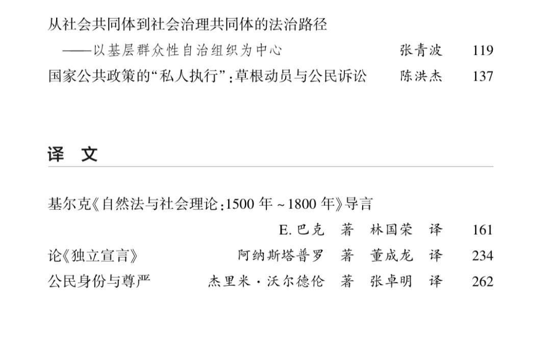 “译文”栏目收录三篇英美学者的佳作,它们由林国荣、董成龙和张卓明译为中文,行文流畅、表意精准,体现了译者扎实的文学功底与精深的学术素养。在《基尔克<自然法与社会理论:1500年~1800年>导言》中,英国历史学家、政治思想家E·巴克,对基尔克所著《日耳曼社团法》中第四卷的五个小节给予了介绍与评论,该书全面而细致地讲述了1500年到1800年间出现的各种现代政治理论。作者不仅阐释了基尔克对政治理论、自然法理论和历史法学派的突出贡献,更重点着墨于基尔克提出的关于团体和团体人格的重要理论,为读者熟悉基尔克的学术思想、乃至了解1500年到1800年间整个自然法与社会法理论的面貌提供了工具。《论<独立宣言>》选自芝加哥大学博雅学科讲师、罗萨里学院政治科学助理教授阿纳斯塔普罗所作的两次公开讲演。第一部分选自讲演《独立宣言:说明与提示》,第二部分选自讲演《再观独立宣言》,前者侧重于叙事,后者则回应了前者提出的部分问题,作者在其中有更多的发挥。阿纳斯塔普罗在开篇即将《独立宣言》在本质上认定为一份发表国内外各种公共目的的公共文件,继而以节为单位,陆续对《独立宣言》的全部内容进行了细致的说明,并针对《独立宣言》中以直接或间接形式出现的人人平等、政府形式、政府目的、幸福、美德等重大议题展开了充分的讨论。在《公民身份与尊严》一文中,美国著名法律和政治哲学家杰里米·沃尔德伦阐述了他的尊严观,即视尊严为一种地位,继而提出,公民身份是尊严的一种类型,并且由于公民身份是如此普遍,每个人都属于一个特定政治共同体,每个人都拥有一个对自己负责的国家,所以公民的尊严就成为了实现人的尊严的最佳方式或优良方针。他认为,公民的尊严不仅能够证成公民的权利,还能够导出公民的义务;公民的尊严意味着对公民的理性能力持有敬重,每个公民都应该获得平等的尊重。