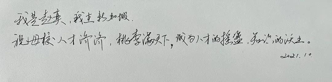 祝福:“参天之木必有其根,环山之水必有其源。”毕业数载,谨遵母校“求实创造,为人师表”之教诲,感念师长呕心沥血、授业解惑之深恩。躬逢母校七秩华诞,敬祝母校年年桃李,岁岁芬芳。
