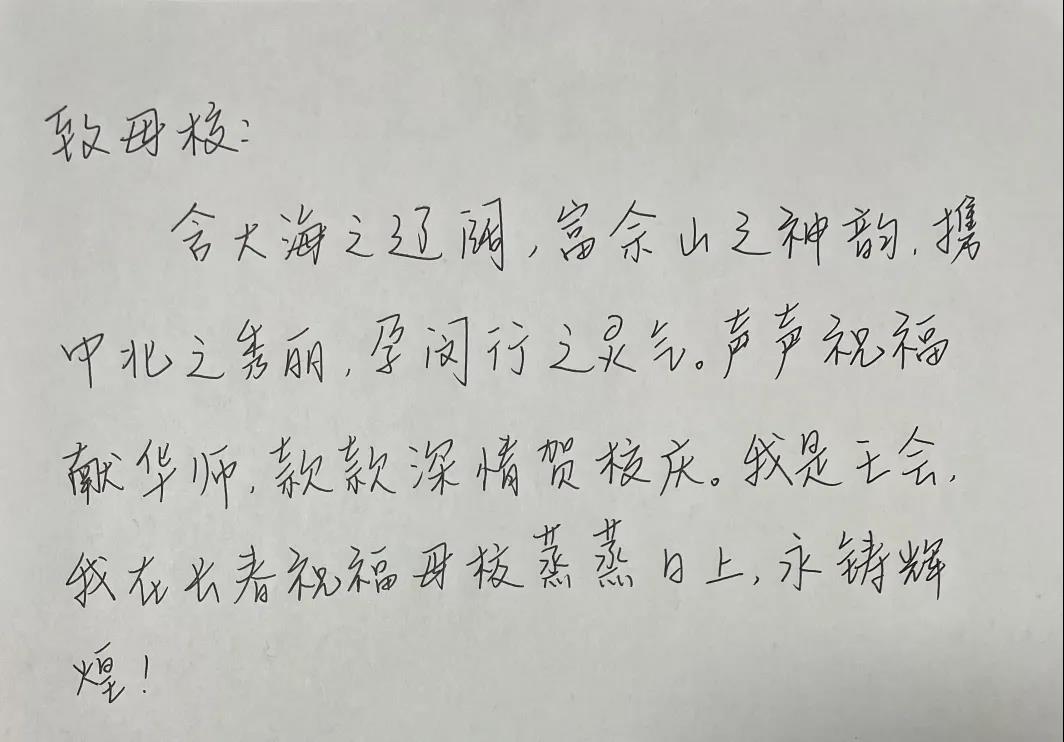 2010级本科、2014级硕士员工,王会,在吉林长春,献上手写祝福。