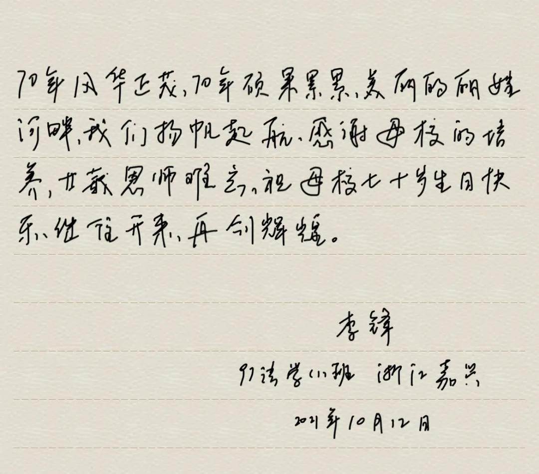 1997级本科员工,李锋,在浙江嘉兴,送上手写祝福。